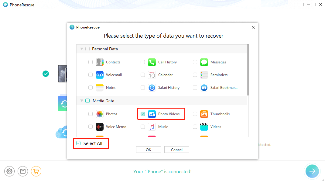 可以看到所有的數據都被選中了。因此,您需要取消選中“全選”框,然後選中“照片視頻”和“視頻”框。不要忘記單擊“確定”。