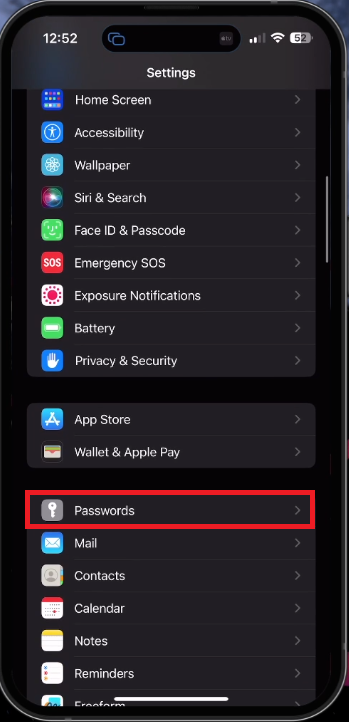 您的設備還可以存儲您的 Instagram 帳戶詳細信息,使您無需密碼即可恢復帳戶。對於 iOS 設備,打開設置菜單。向下滾動並選擇“密碼”。