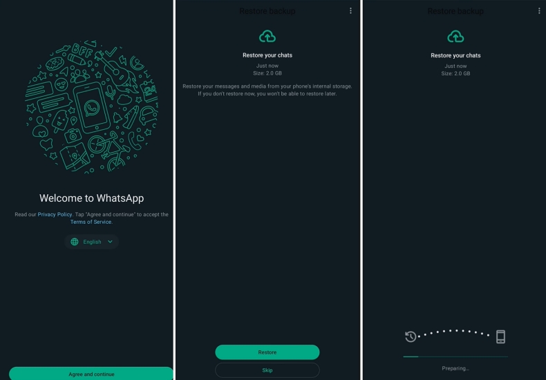 步驟 4。當 WhatsApp 從手機內部存儲中找到可用備份時,輕點恢復恢復您的 WhatsApp 備份。