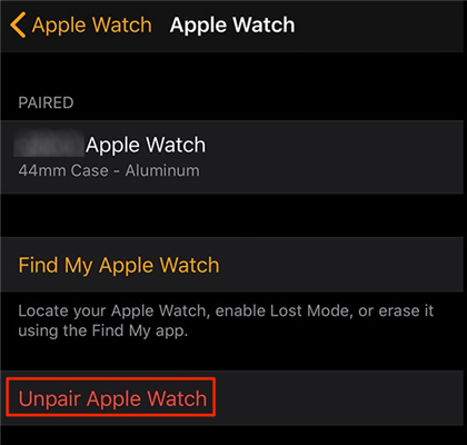 步驟 3. 您會發現一個選項,顯示“取消配對 Apple Watch”。點擊此選項,它將從您的帳戶中刪除配對的手錶。