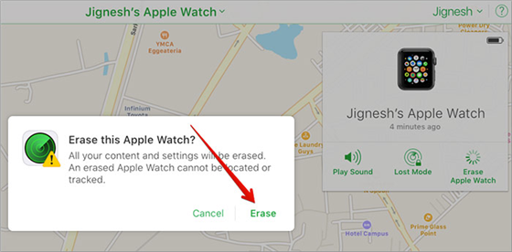 步驟 4. 選擇“擦除 Apple Watch”選項,然後按照屏幕上的說明完全擦除您的手錶。在從帳戶中刪除手錶之前,這一點很重要。