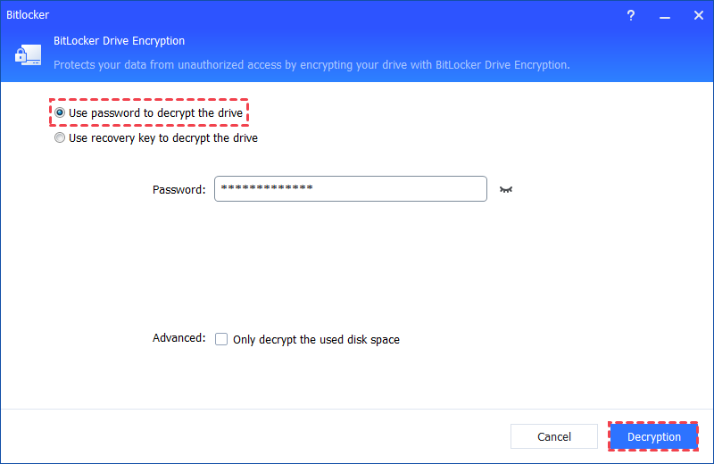 如果您選擇“使用密碼解密驅動器”,請輸入正確的密碼,然後單擊“解密”按鈕。