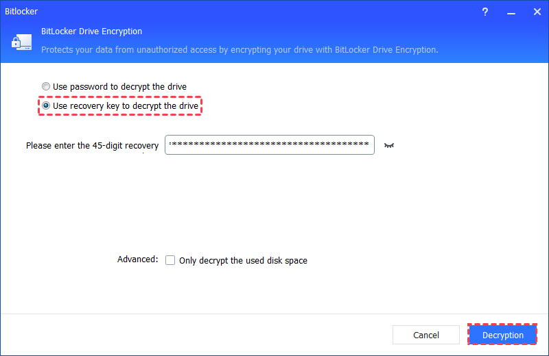 如果您選擇“使用恢復密鑰解密驅動器”,請輸入加密驅動器時保存在 TXT 文件中或打印的恢復密鑰,然後單擊“解密”按鈕。