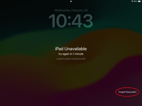 步驟1。在 iPad 不可用屏幕上,點擊忘記密碼?屏幕底角的選項。