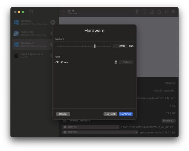 - 現在是時候根據您的主機 Mac 硬件來配置虛擬機和硬件分配了。目標是至少 8GB RAM 和 64GB 磁盤空間或更多