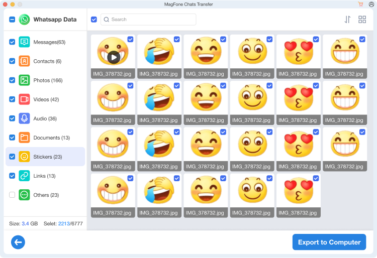 備份完成後,單擊“完成”。在導出頁面上,您可以預覽所有 WhatsApp 數據,包括照片。選擇照片或挑選您需要的照片導出到計算機。