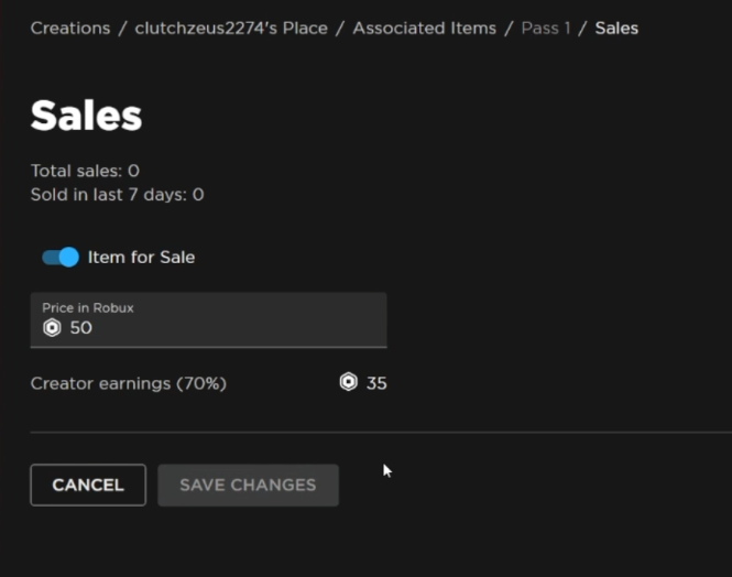 為通行證上傳一張引人注目的圖片,為其命名,然後以您想要的價格出售。注:Roblox 收取 30% 佣金;將通證定價為 10 Robux 將產生 7 Robux。