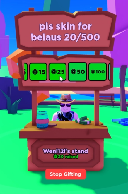 “請捐贈”Roblox 體驗是一個促進贈送過程的平台,Roblox 不正式支持用戶之間直接進行 Robux 交易。