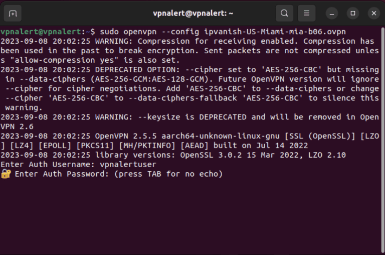 - 運行命令“sudo openvpn –config ServerFile.ovpn” 在您的終端上啟動 OpenVPN。確保您位於步驟 7 中提取的文件的目錄中。我為我的服務器文件添加了美國邁阿密服務器的詳細信息。