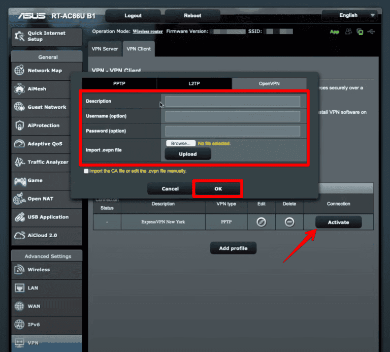 - 選擇開放VPN協議,然後輸入憑據。然後,上傳路由器配置文件您在第四步中下載了。