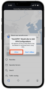 - 授予 NordVPN 添加 VPN 配置的權限。Android 用戶必須在出現提示時接受任何連接請求。