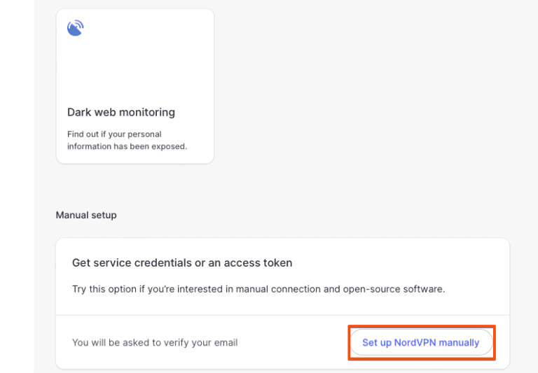 - 去你的NordVPN 儀表板>服務>北VPN並點擊“手動設置 NordVPN”。