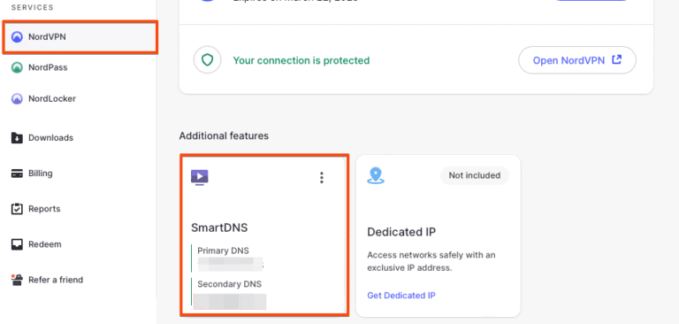 - 單擊下面的 NordVPN服務和啟用智能DNS在“其他功能”下。