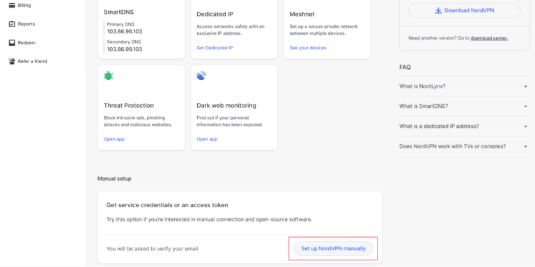 - 去你的Nord 帳戶儀表板並點擊“手動設置 NordVPN”在頁面的末尾。