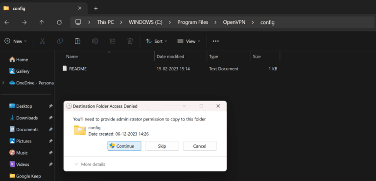 - 將文件粘貼到 Windows 11 PC 上的目錄 [C:Program FilesOpenVPNconfig]。點擊 ”繼續” 如果需要管理員訪問權限。
