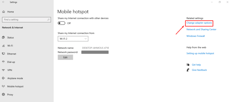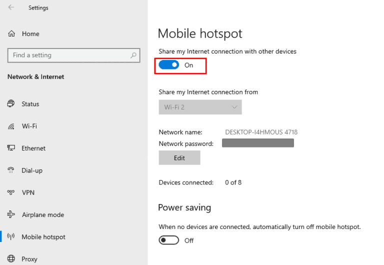- 在下面 ”分享我的互聯網連接,“ 選擇無線上網並啟用移動熱點。