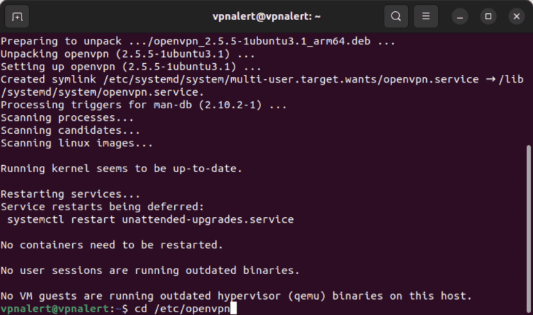 - 類型 ”sudo apt-get 安裝 openvpn”來安裝 OpenVPN。