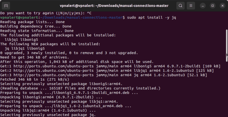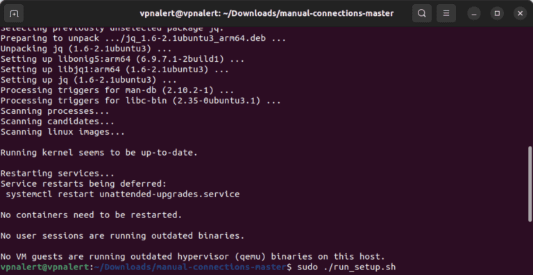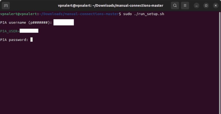 - 安裝 jq 後,使用命令“重新運行腳本”須藤./run_setup.sh”並輸入您的 PIA 用戶名/密碼。