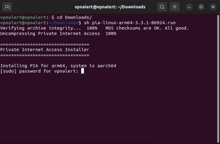 - 使用命令“sh [Linux PIA 文件的文件名]”。在這種情況下,我輸入了命令“sh pia-linux-arm64-3.3.1-06924.run”。