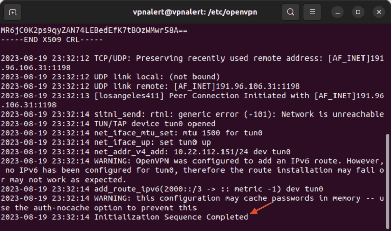 - 一旦顯示“初始化序列完成,”您已成功連接到 Linux 系統上的 PIA。