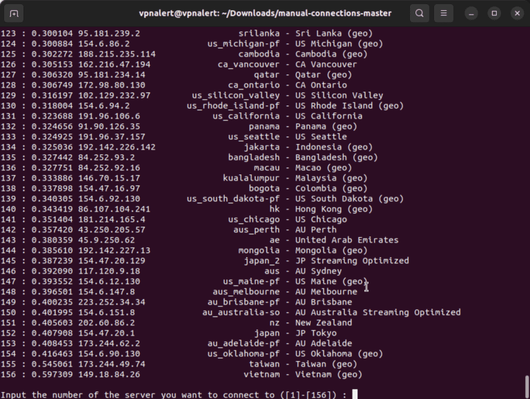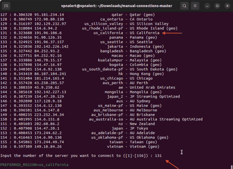 - 選擇您首選的服務器位置。我將選擇美國 - 加利福尼亞州 (131) 作為本指南。