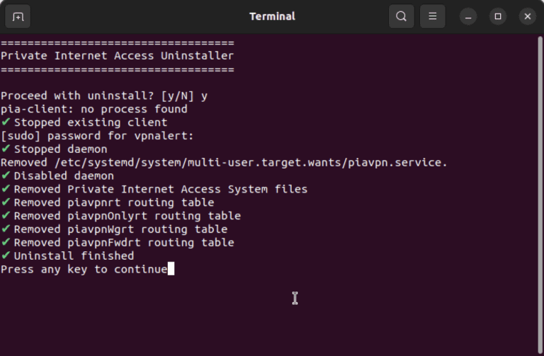 PIA 應用程序現已從您的 Linux 系統中完全卸載。
