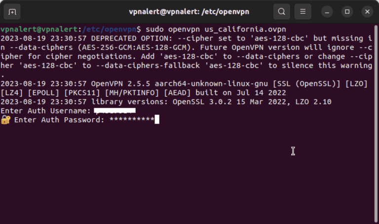 - 輸入命令“sudo openvpn cofig-服務器位置名稱.ovpn”。在這種情況下,我輸入了“須藤 openvpn us_california.ovpn”。