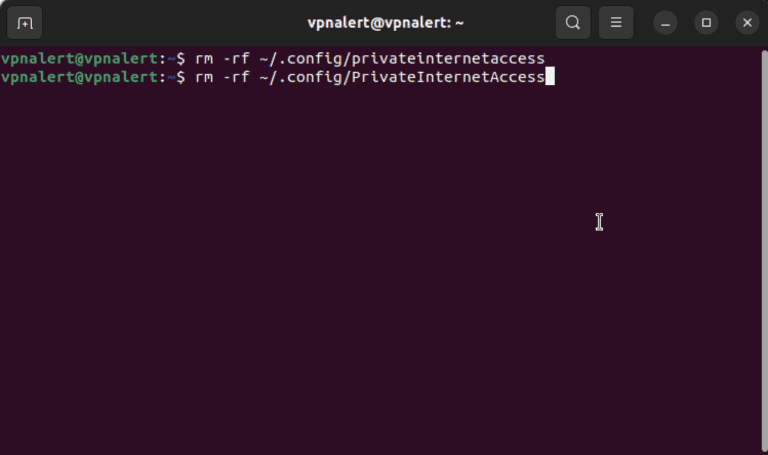 - 輸入命令“rm -rf ~/.config/privateinternetaccess”並按 Enter 鍵。