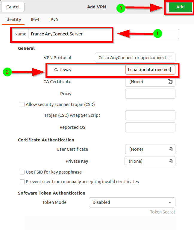- 為連接設置任意名稱。我將使用“法國 AnyConnect 服務器”以方便參考。