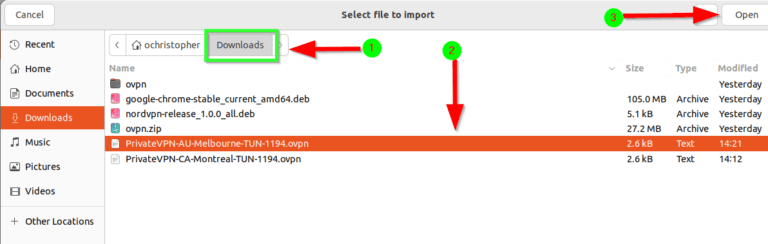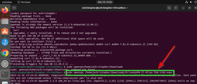 - 就我而言,命令是[sudo openvpn /home/ochristopher/Downloads/PrivateVPN-IT-Milan-TUN-1194.ovpn]。