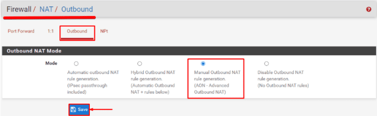 - 點擊手動出站 NAT 規則生成 (AON) 高級出站 NAT。這是下面的第三個選項模式。