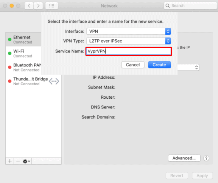 對於 Mac,您無法使用該應用程序來共享您的連接。這是因為 VyprVPN 設置不適用於 OpenVPN 或 Chameleon,為了獲得最佳結果,您需要設置本機 L2TP/IPSec 連接。