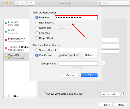 第5步:打開認證設置並輸入您的VyprVPN 密碼在密碼字段中。