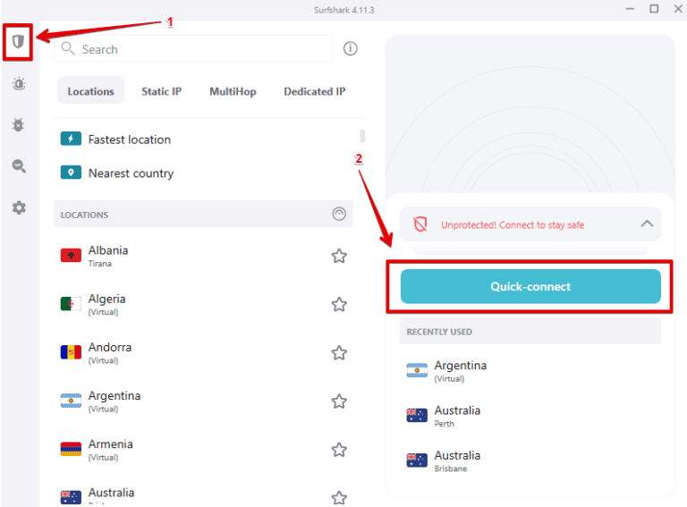 - 點擊左上角的 VPN 圖標,選擇您選擇的服務器,或單擊“快速連接”以獲得最快/最近的服務器。