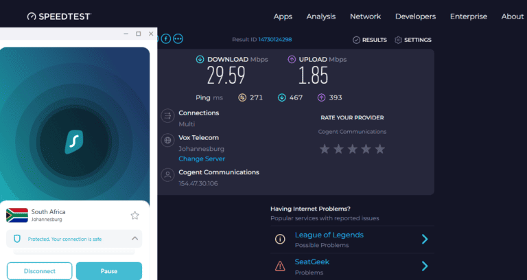 Surfshark 在我的 30 Mbps 連接上達到 29.59 Mbps,這意味著您可以在 Chromebook 上享受流式傳輸高清內容、更快地下載文件以及無緩衝或延遲地瀏覽。