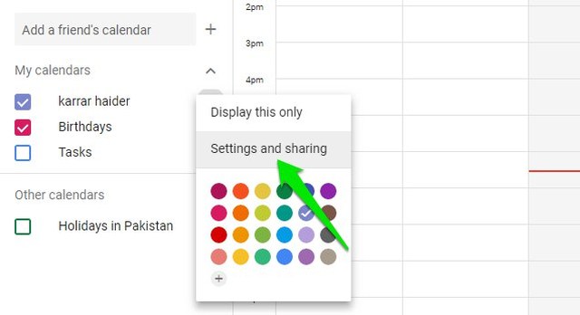 2. 單擊要共享的日曆旁邊的三個垂直點菜單,然後選擇“設置和共享”從它。