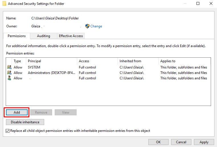 第4步:向下移動光標,這一次,單擊添加選項,您可以在禁用繼承按鈕之前找到該選項。