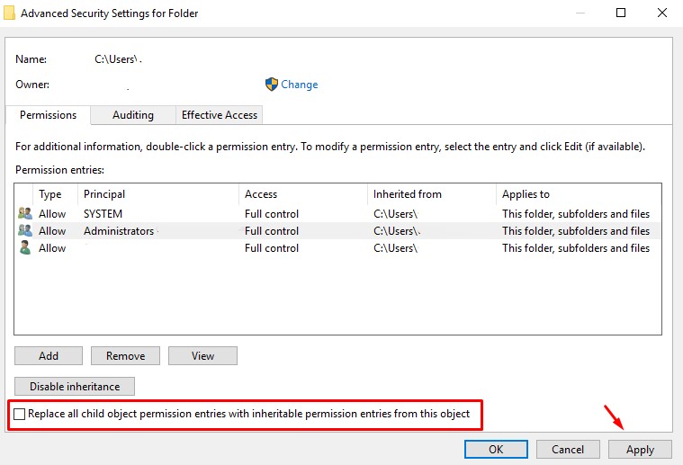 步驟一: 在“高級安全設置”頁面下,勾選允許您替換所有者對象和子容器的框。然後向下移動光標以勾選該框,該框將使您能夠替換每個子對象權限條目。