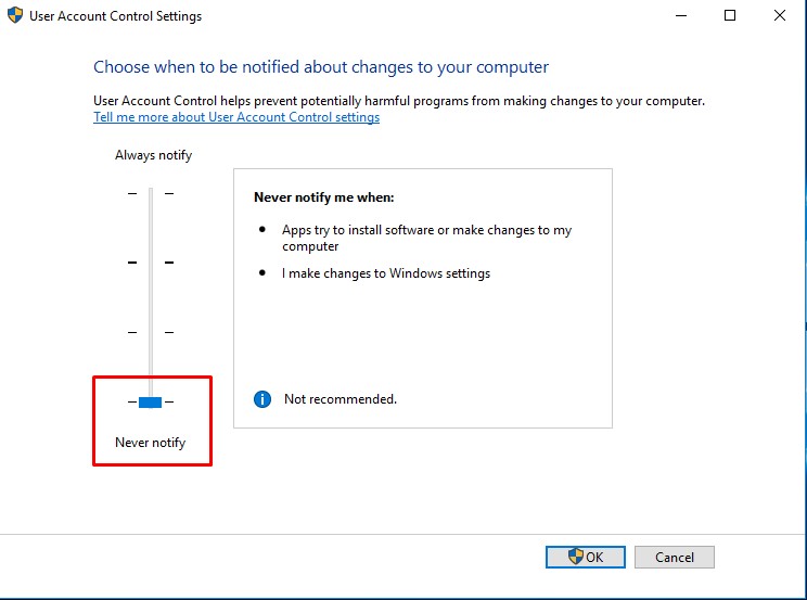 步驟3:接下來的頁面應該有一個滑塊。在這裡,按下滑塊並將其向下拖動到“從不通知“ 選項。
