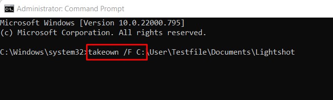第5步:takeown /FX:在此處放入受影響文件的位置