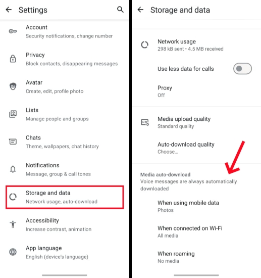 如果您想更改 WhatsApp 照片保存設置,可以在 WhatsApp 設置中找到存儲和數據。在此頁面中,您可以配置照片自動下載質量以及自動保存照片的數據。