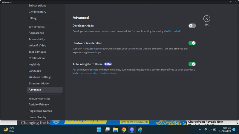 在下面 ”應用程序設置”。 - 滾動到“先進的”並關閉“硬件加速”。