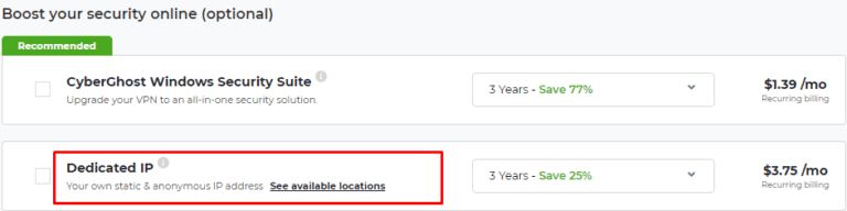 第4步:在結帳之前,您還可以選擇在採購訂單中包含專用 IP(最佳)。與共享IP地址相比,專用 IP 對您來說是獨一無二的,因此不太可能被 Hulu 列入黑名單。