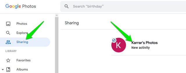 6. 然後,從輔助帳戶訪問 Google Photos,然後從左側主菜單中單擊“分享”然後點擊“(帳戶名稱)照片”活動。