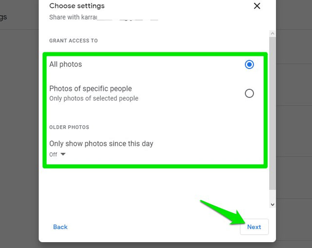 4. 可以通過三種方式授予訪問權限。您可以授予對所有照片、僅特定人物或特定日期之前的照片的訪問權限。做出選擇並單擊“下一個”。