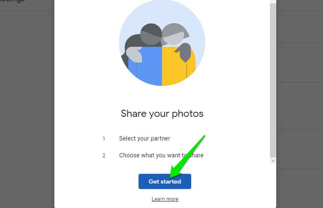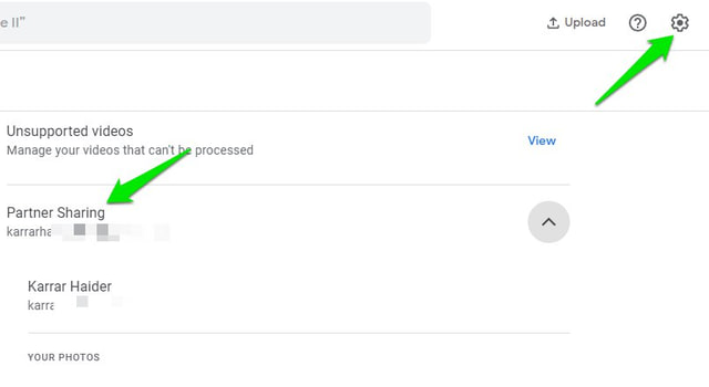 1. 打開你的Google 相冊帳戶並單擊"設定"右上角的齒輪圖標,然後單擊“夥伴分享”選項。