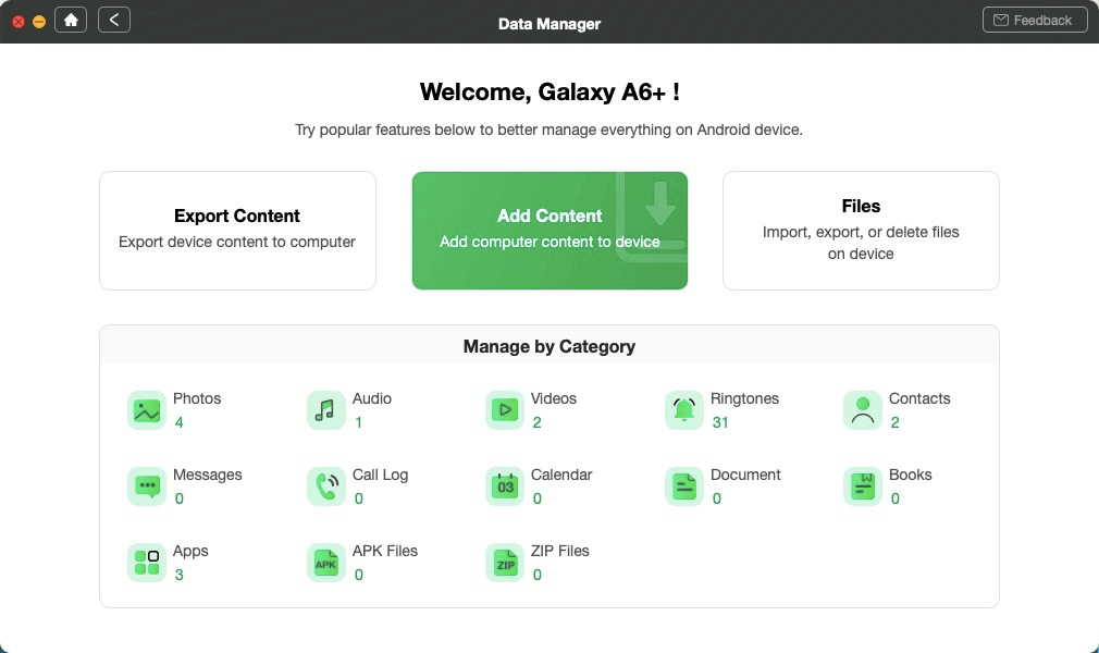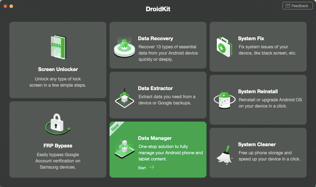 步驟1。啟動DroidKit,並使用USB電纜將您的Android設備連接到計算機。從主屏幕中選擇數據管理器模式。