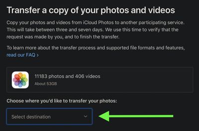- 下一頁將告訴您將從 iCloud Photos 複製多少圖片和視頻以及它們需要多少存儲空間。點擊在“選擇您想要將照片傳輸到的位置”下,單擊下拉菜單,然後選擇谷歌照片。