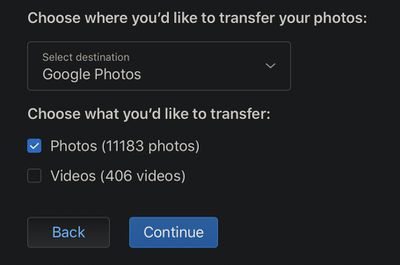 - 使用複選框指示是否要傳輸照片或視頻,或兩者都傳輸,然後單擊繼續。