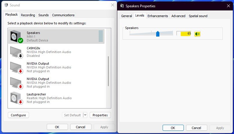 如果沒有,則啟用它。接下來,右鍵單擊該圖標並選擇特性。上特性面板,下級別,確保通過滑動滑塊將音量調整到適當的水平。另外,請通過單擊音頻圖標確保設備未靜音。